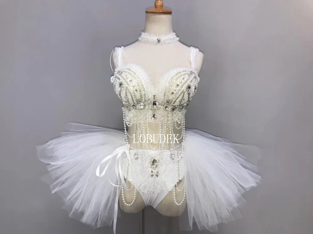 Hot Price White Pearls Stones Bikini LED Bubble Skirt Set Women Sexy Nightclub DJ DS Costumes Bar Party Dance